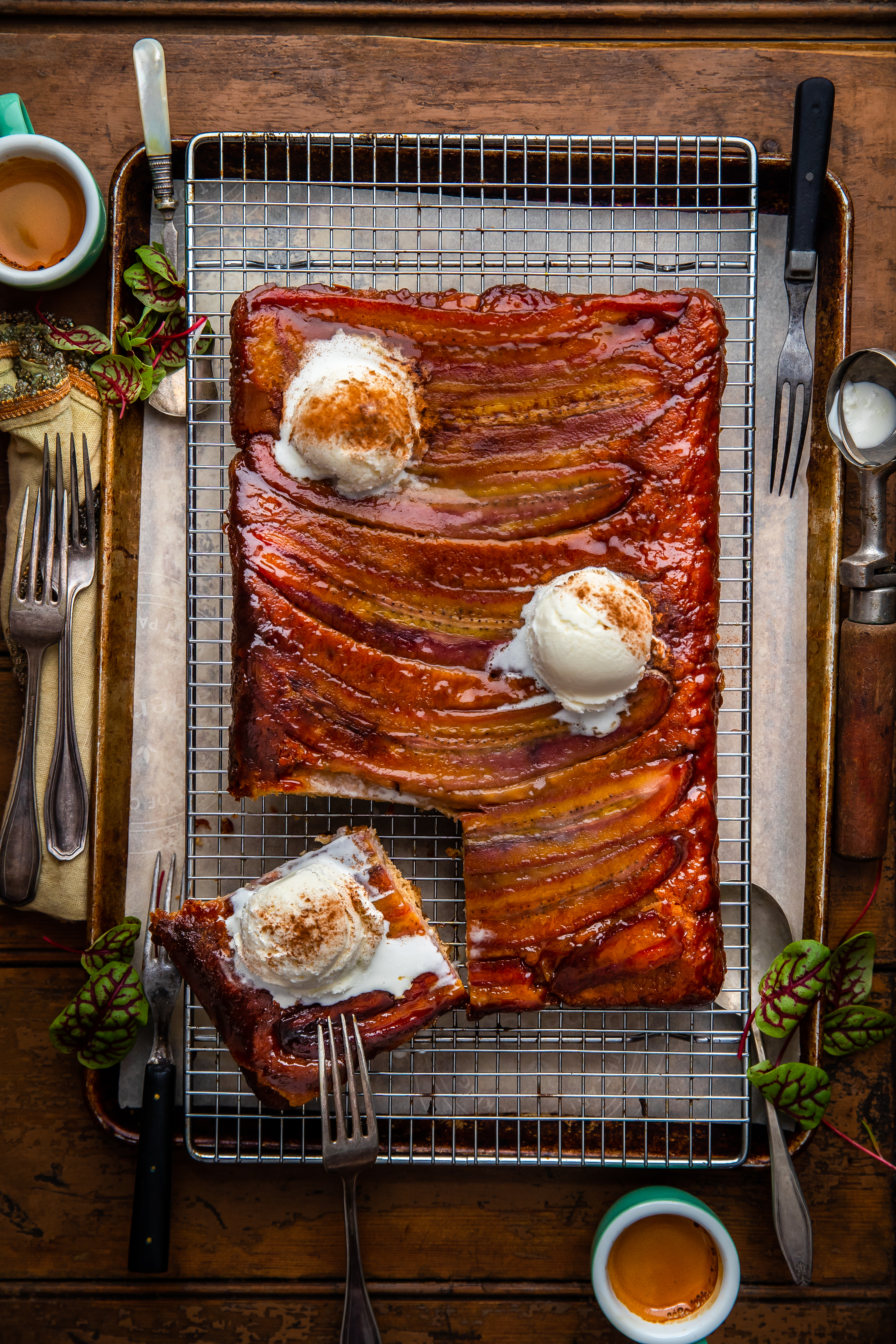 - Upside Down time! Invert the cake onto a platter (quick & confident is key here), then top with ice cream & a sprinkle of cinnamon. Serve! So delicious!
