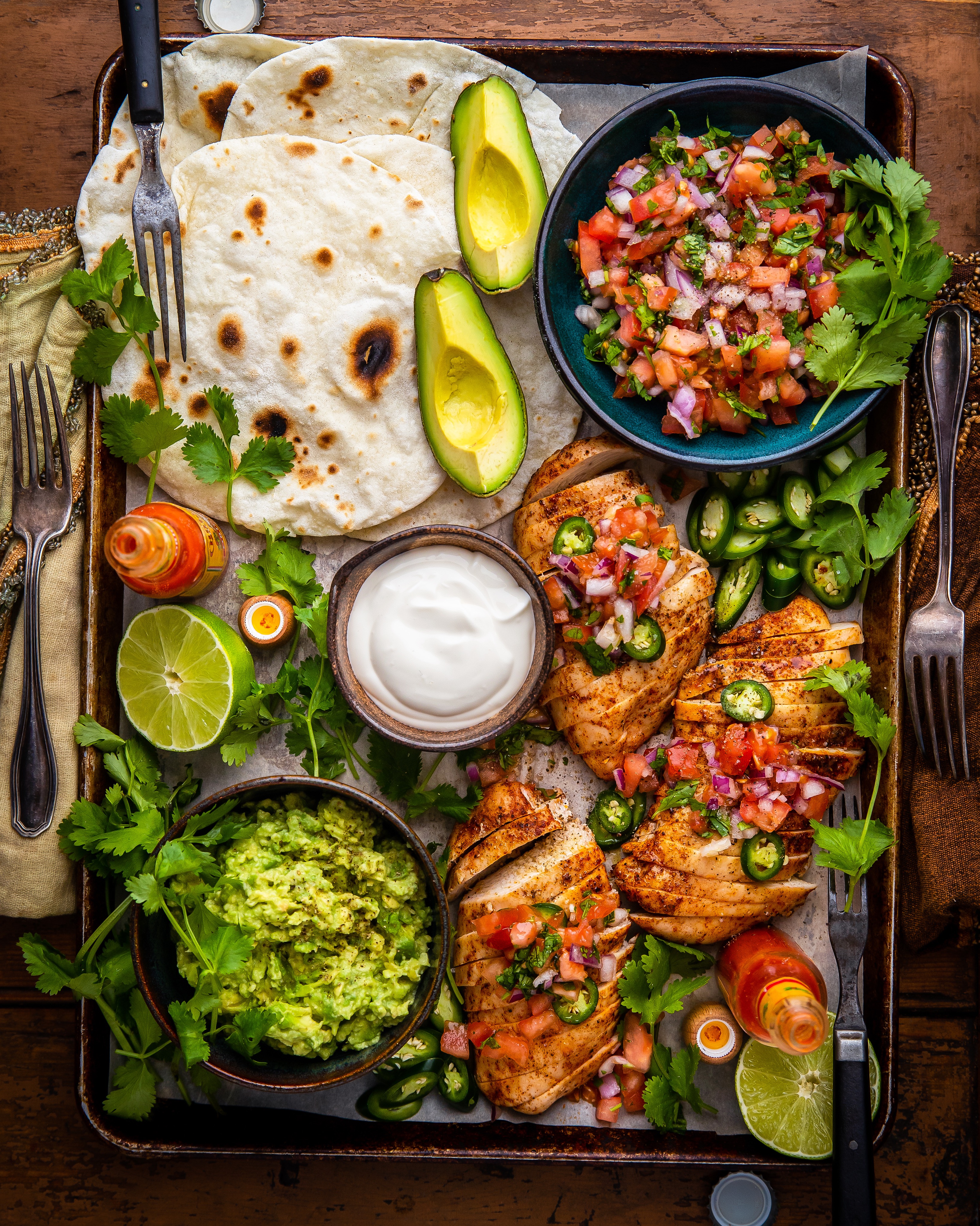 Build your fajita serving board with sliced grilled chicken, warm tortillas, fresh pico, guacamole, spiked-sour cream, grilled peppers and red onions. Garnish with sliced jalapeno, radishes, and fresh cilantro, and serve with lime wedges and hot sauce. Fajita Night, done right. Delicious!