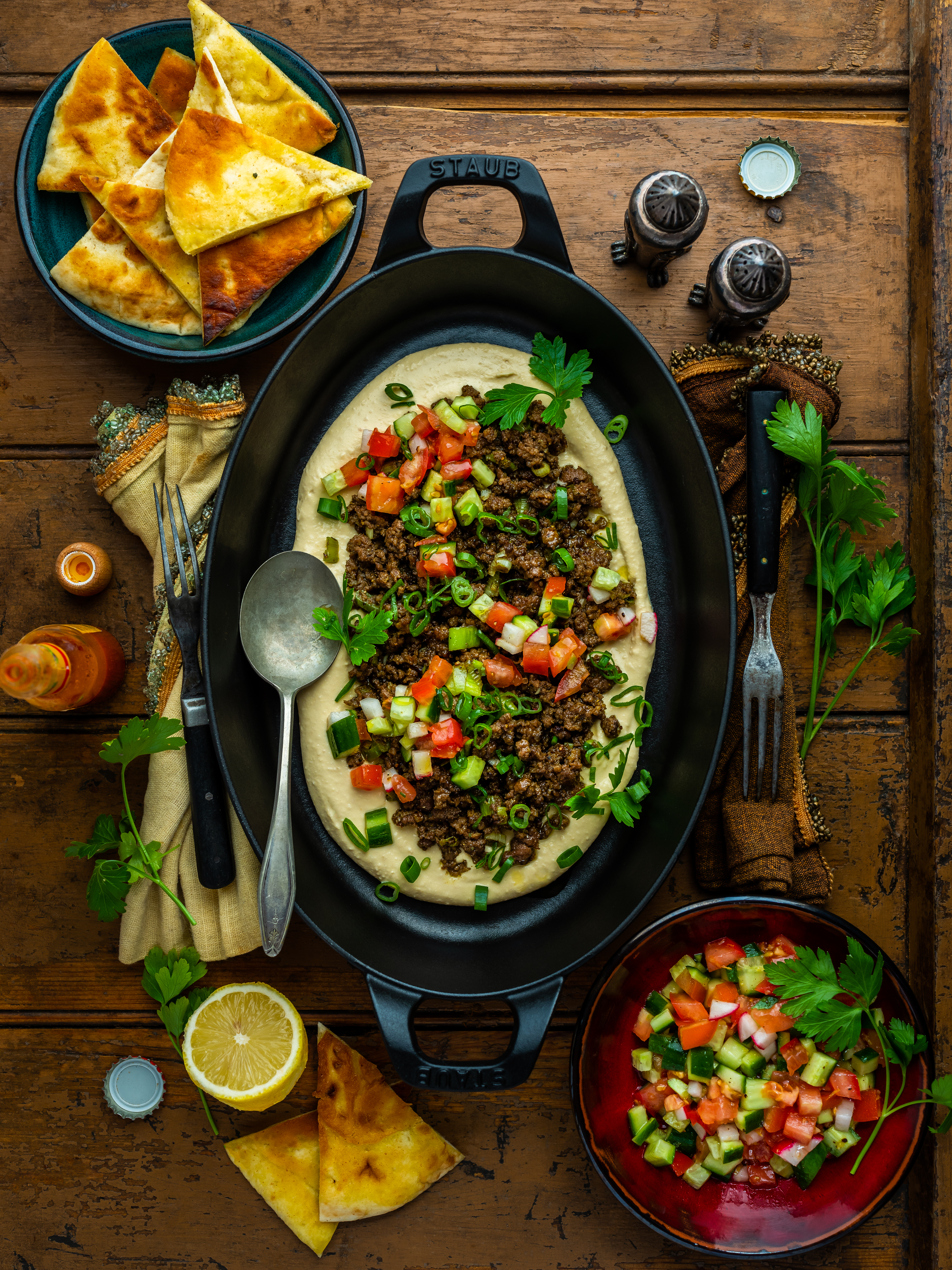 - Spread the hummus onto a serving platter, then top with the spiced beef. Sprinkle over the green onions, garnish with parsley, and serve with your salad, toasted pita chips, and extra lemon. Delicious!!