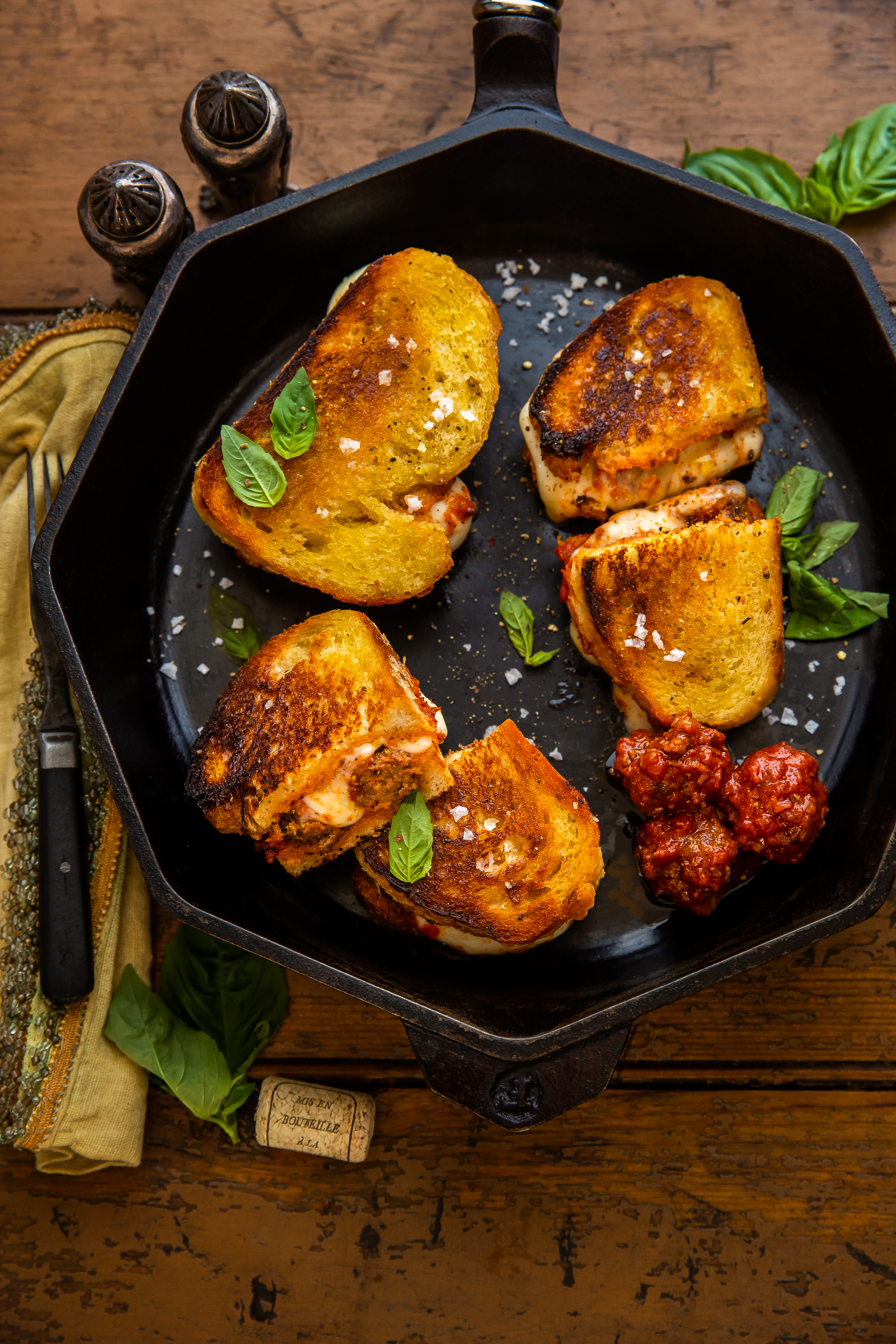 - Sandwich time. Liberally butter the outside of each piece of bread. Coat the inside of each piece of bread with about a tablespoon of marinara, then top with meatballs and sliced cheese. Add a few basil leaves, coat the second piece of bread with marinara, then sandwich. Easy peasy.