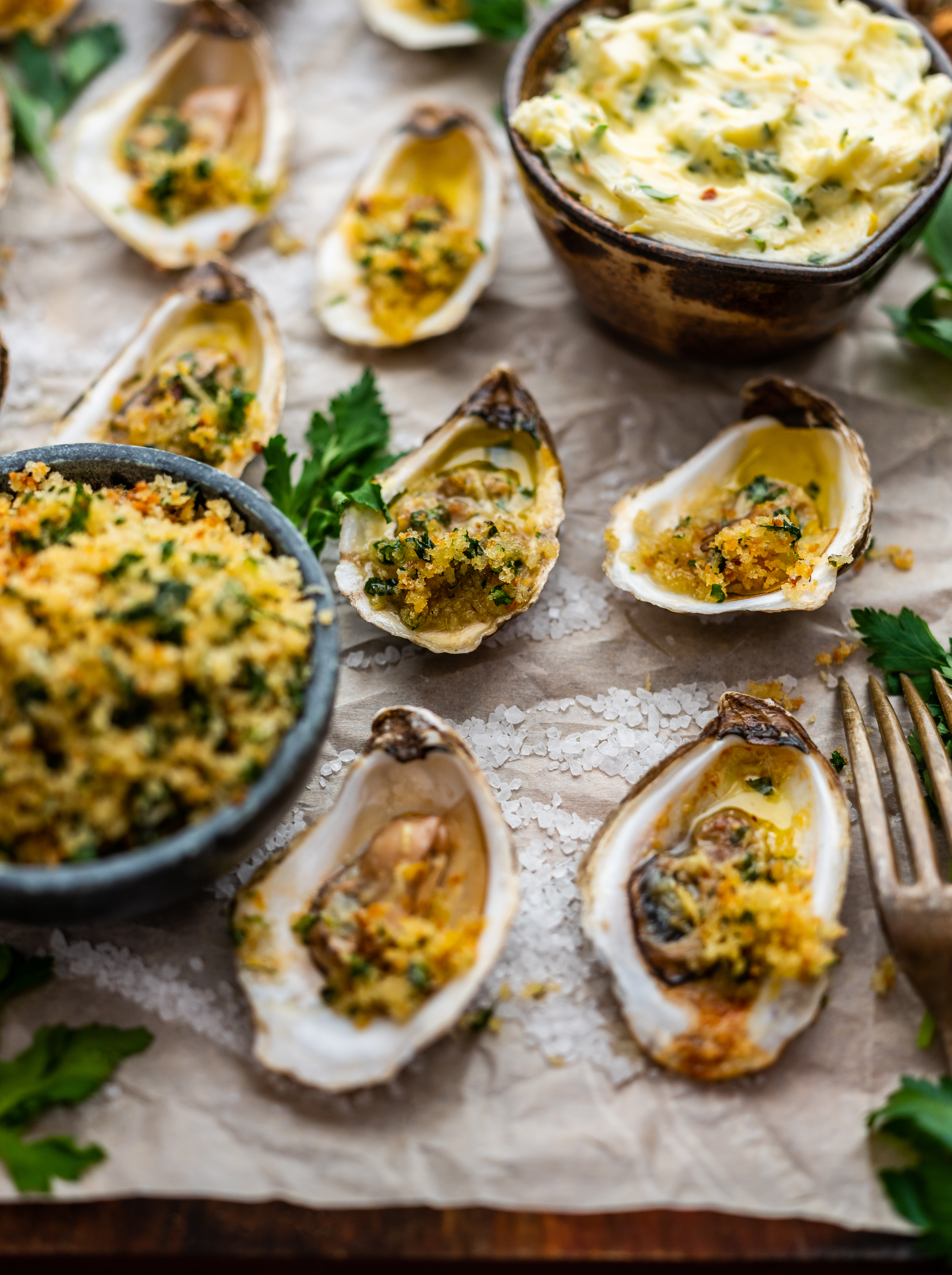 Baked Oysters with Spicy Garlic Compound Butter & Lemon Parm Pangrattato