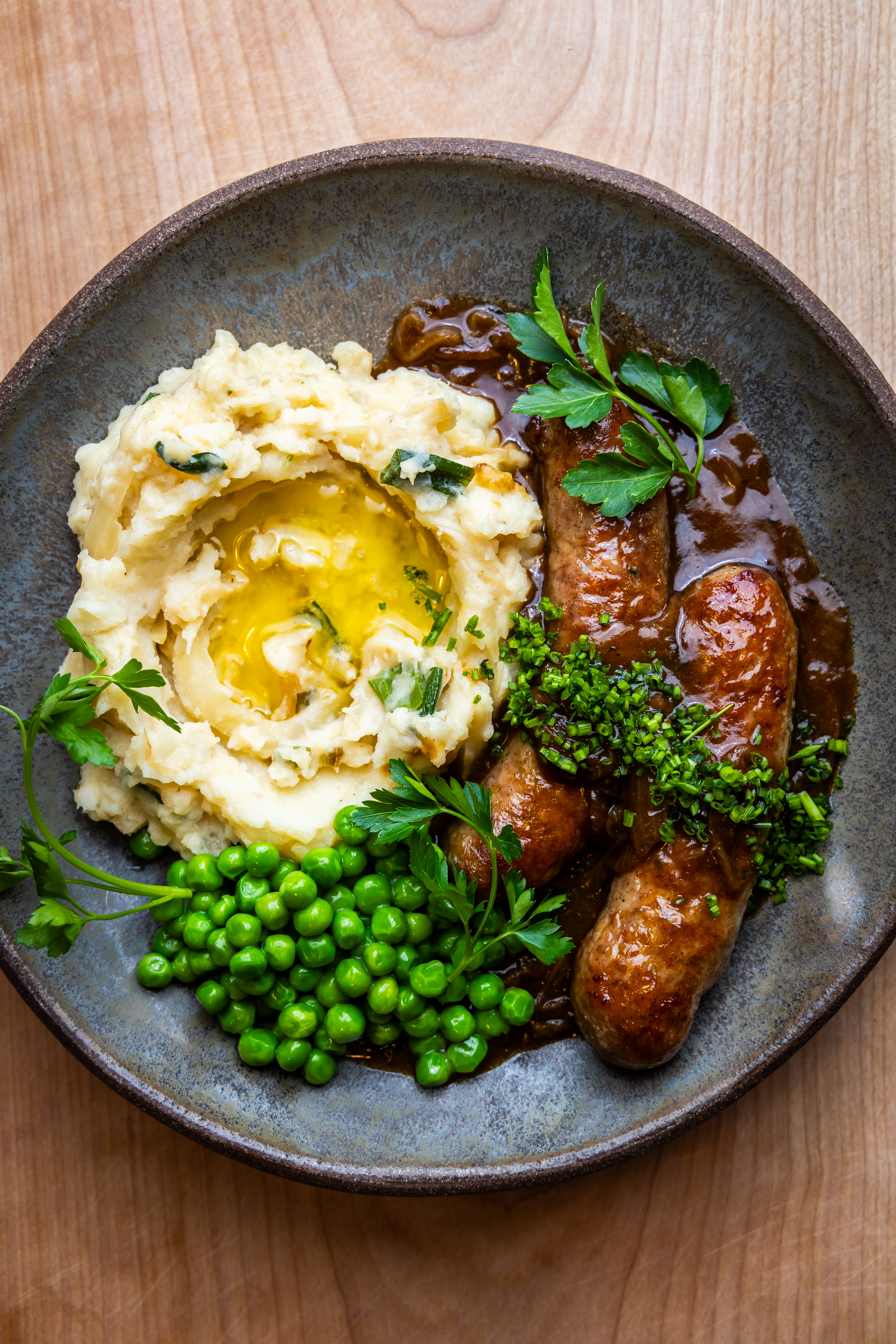 Plate up your colcannon with heaps of gravy, sausages, more gravy, peas, and fresh chives, and serve with a pint. Sláinte!